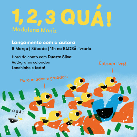 As edições Orfeu Negro e a ilustradora Madalena Moniz chamam toda a gente para o grande lançamento de 1, 2, 3… QUÁ, o novo livro cartonado para bebés e leitores mini! Num luminoso dia de neve, 1 Mãe Pata e os seus 7 patinhos vão passear no parque. De repente, há menos 1 patinho à vista. E logo a seguir, há menos 2 patinhos. Na companhia do incrível Duarte Silva, vamos desvendar o mistério de 7 patinhos perdidos e uma Mãe Pata muito aflita. No fim, há autógrafos, brincadeiras e um lanchinho. Venham contar connosco: 1, 2, 3... QUÁ!