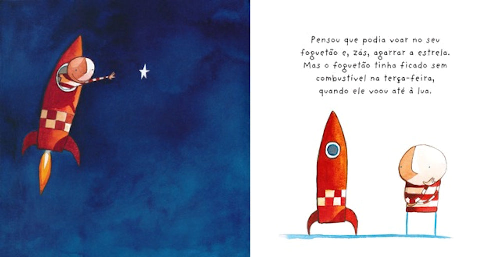 À noite, ia para a janela e sonhava com o dia em que teria uma estrela só dele. Imaginava que seriam amigos e brincariam às escondidas. Foi então que decidiu partir em busca de uma estrela. Esperou, saltou bem alto, até pensou voar no seu foguetão, mas faltava o combustível... Começou a pensar que nunca teria uma estrela amiga.