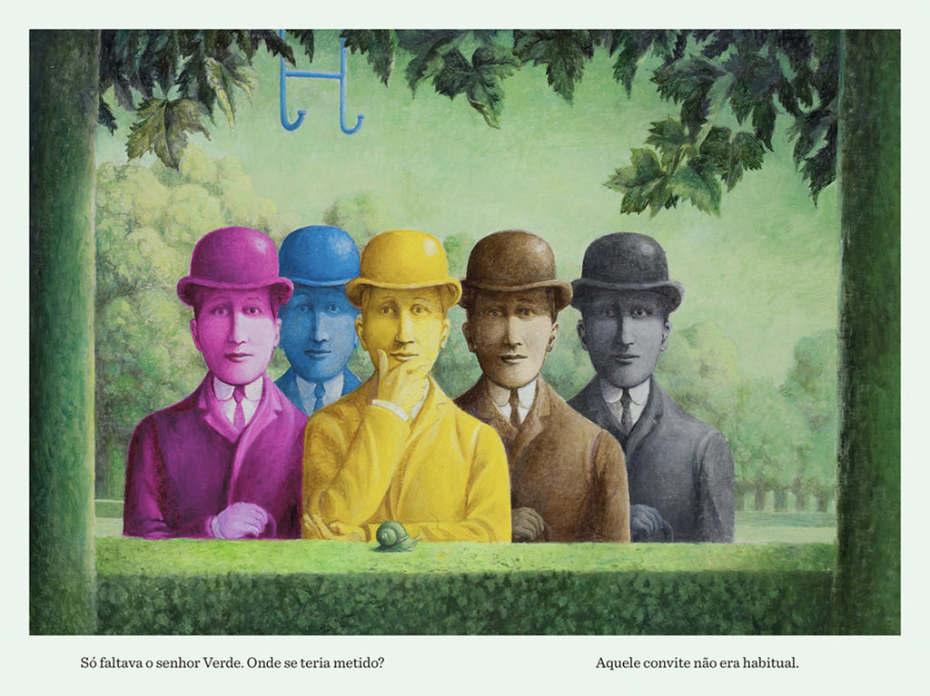 O LANCHE DO SENHOR VERDE parece inspirar-se nos quadros de René Magritte, com os seus jogos visuais e cromáticos e os seus homens de chapéu-de-coco.